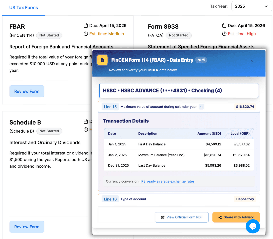 Connect accounts across countries, get a clear cross-border tax outlook, stay on top of FBAR and FATCA (Form 8938), and share tax-ready data with your advisor